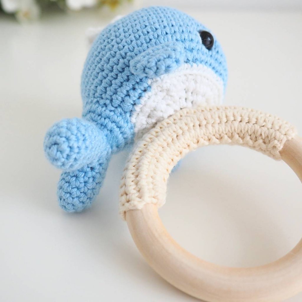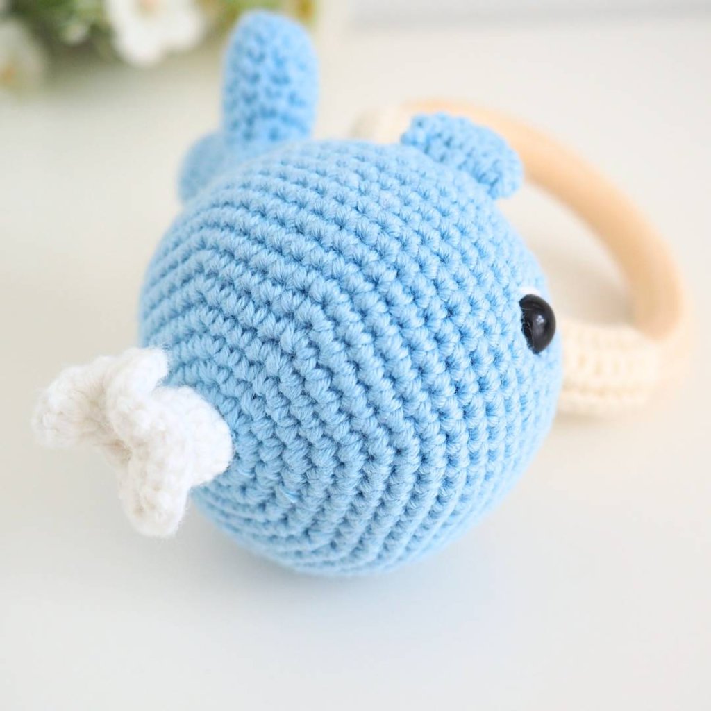 Háčkované chrastítko na dřevěném kroužku Velryba Modrá