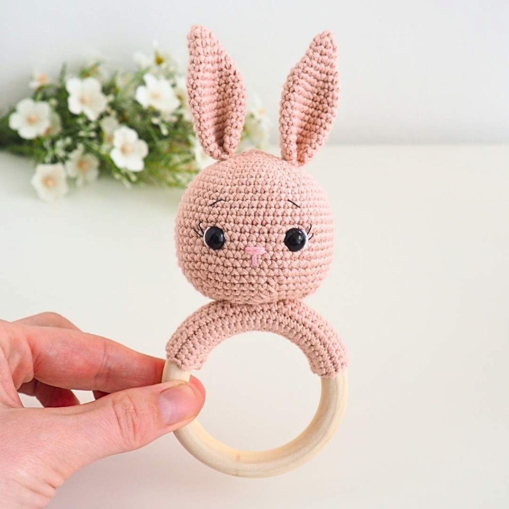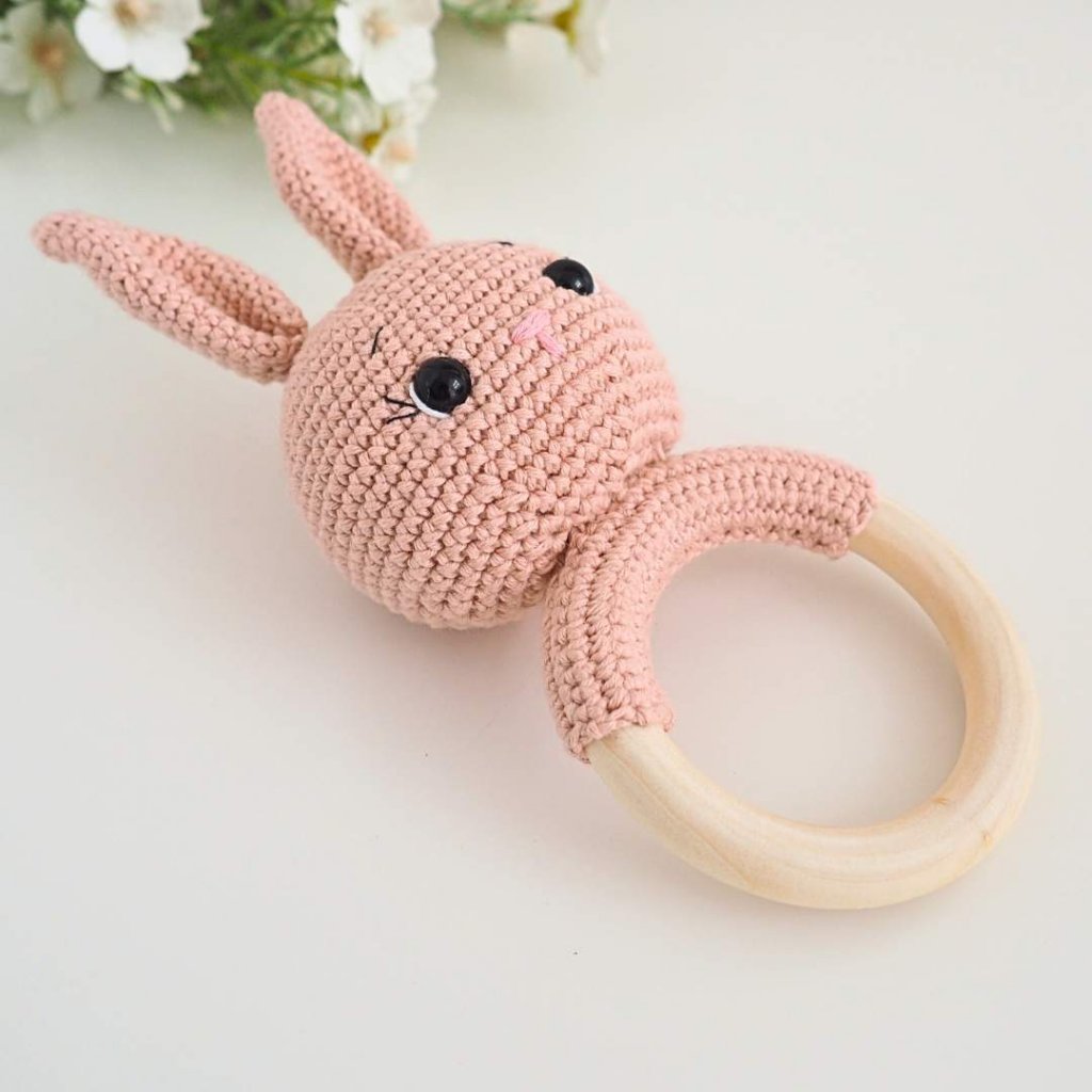 Háčkované chrastítko na dřevěném kroužku Králíček Růžový