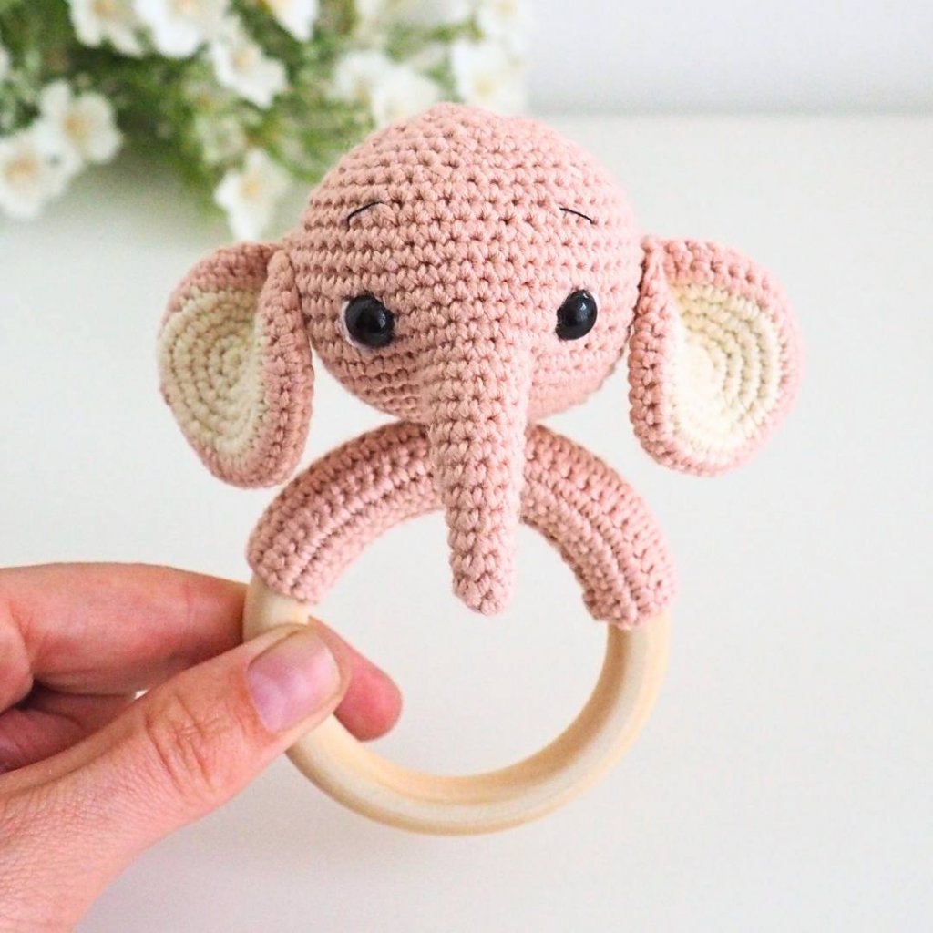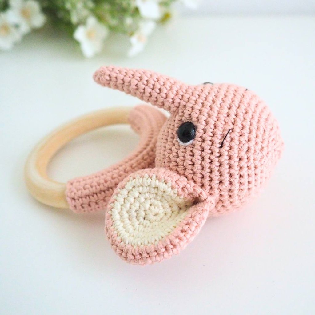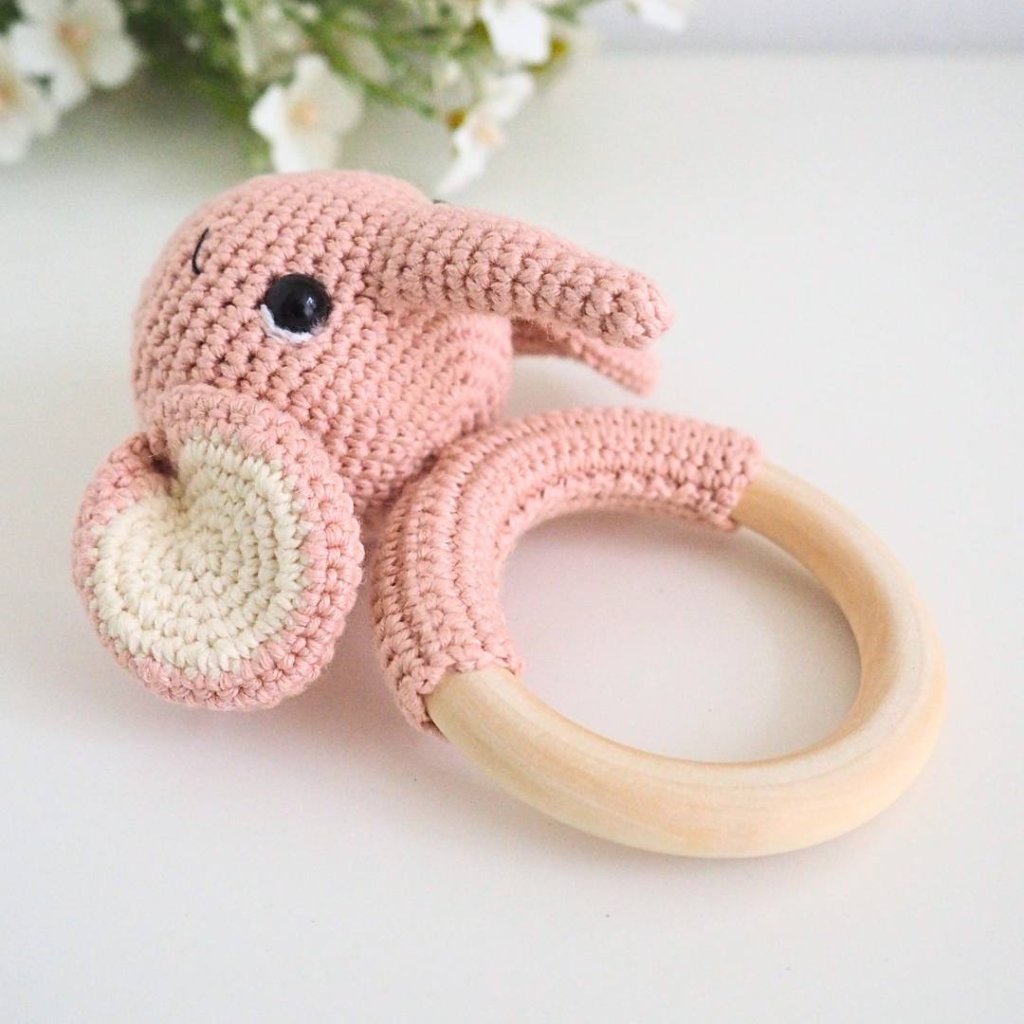 Háčkované chrastítko na dřevěném kroužku Sloník Starorůžový