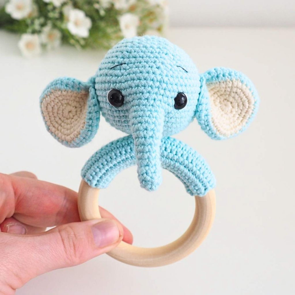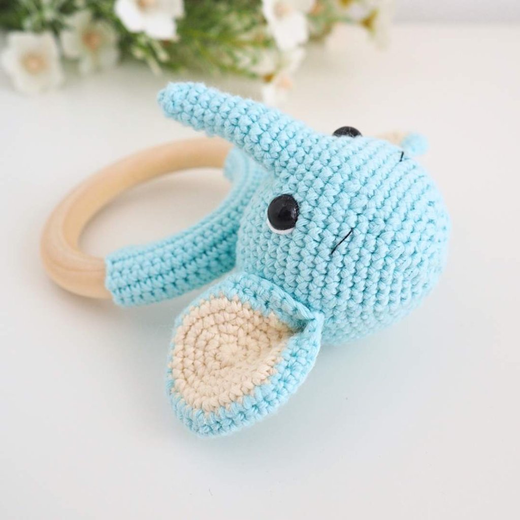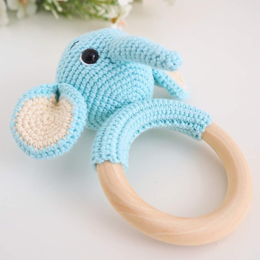 Háčkované chrastítko na dřevěném kroužku Sloník Světle modrý