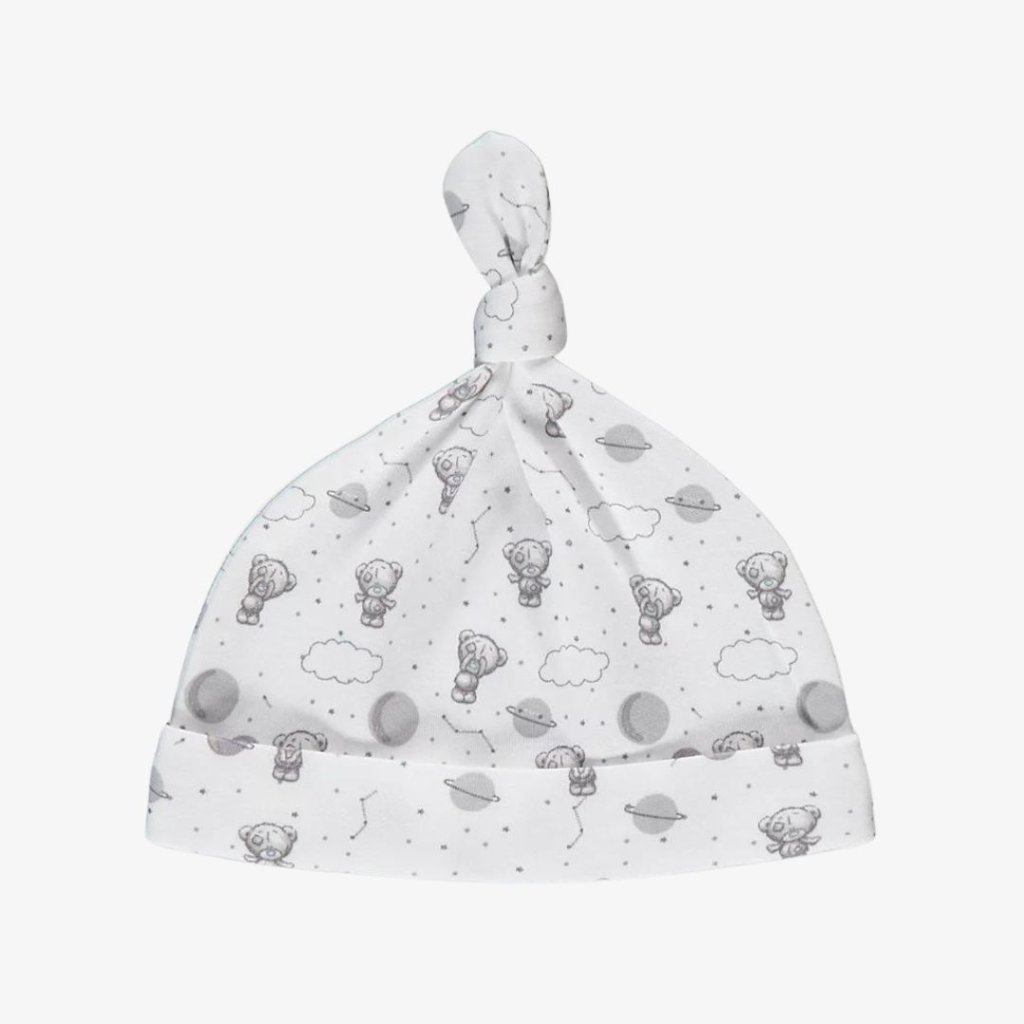 - Bílá čepička a šedý bryndáček s potiskem